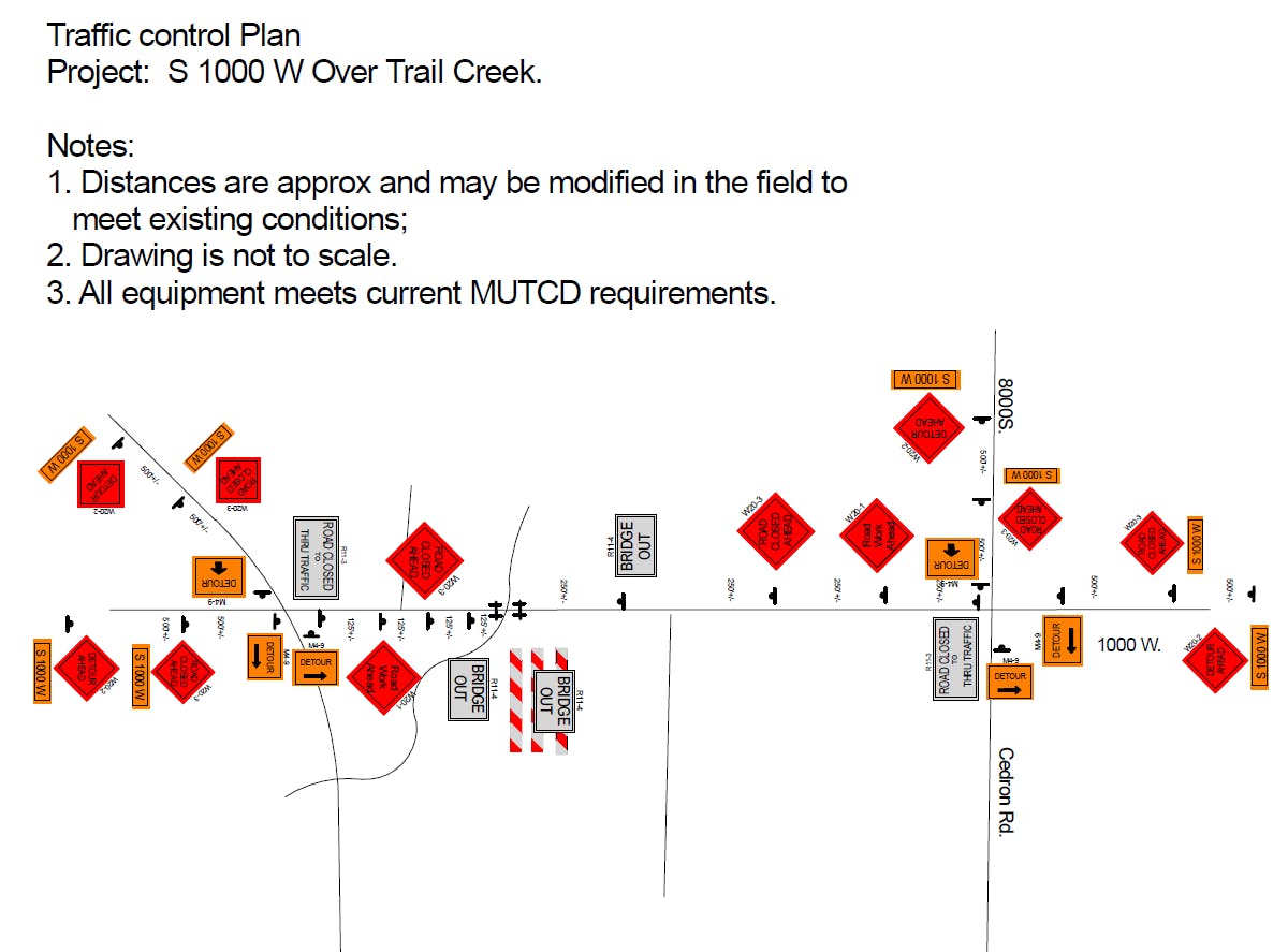 NOTICE : Bridge Key 33038 - Bridge Replacement at 1000 S (Crystal Ave) Bridge will be replaced with a new premanufactured steel bridge and Cast-In-Place abutment system. Work will begin on August 25, closing 1000 S ( Crystal Ave) to through traffic and must be completed within 75 working days of starting construction. Once started, work must continuously progress until completion, except for paving. If all project structure and roadway work items are complete, and weather does not permit project 405 paving to occur within the specification requirements, time may be suspended by the Engineer until weather allows.