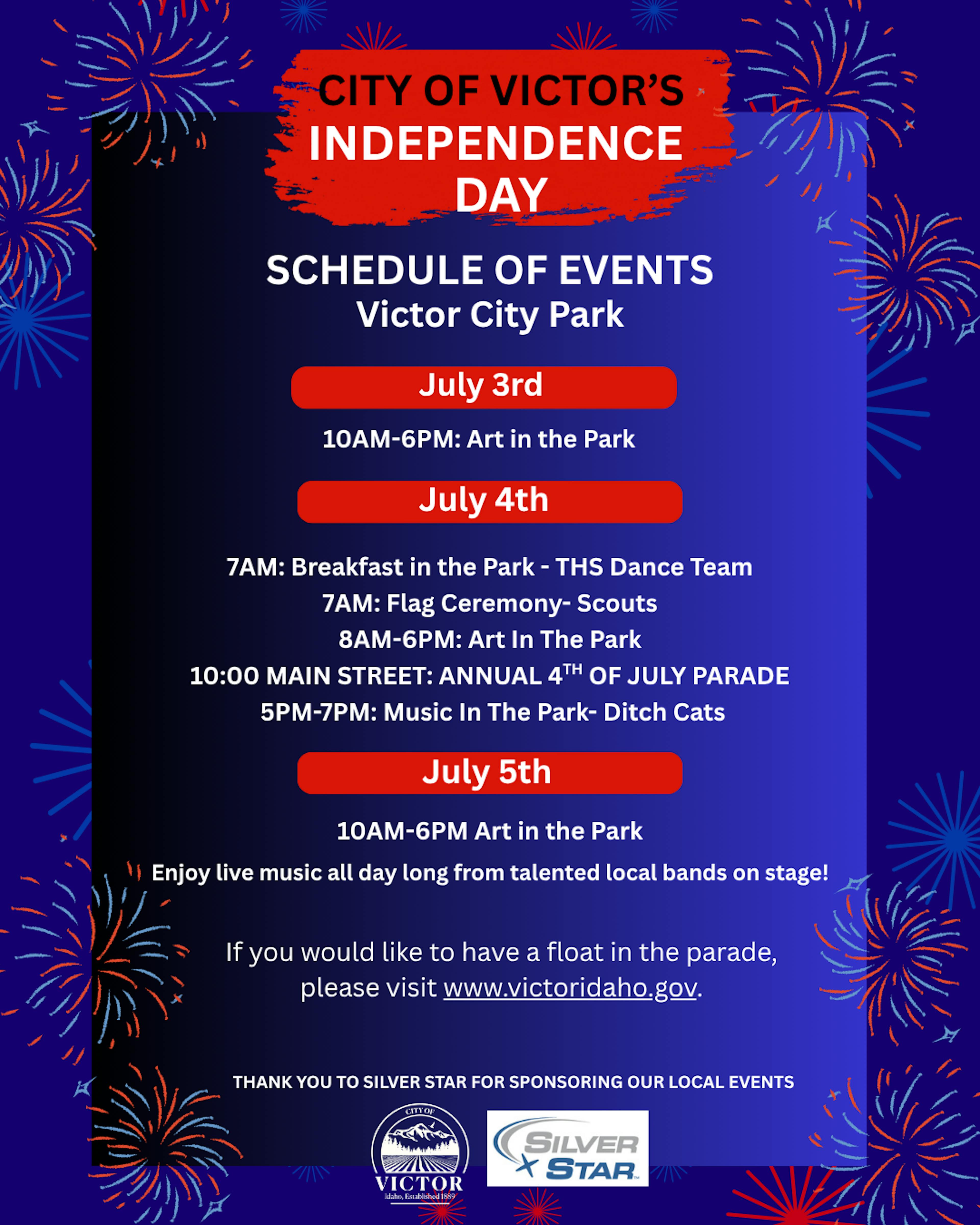 Visit the City Events page to view all upcoming events happening on July 4th in Victor.