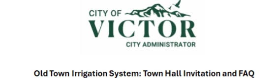 The City of Victor is hosting a town hall on August 7, from 6-8 pm, to discuss the future of the Old Town Irrigation System. Most city residents are not part of the Old Town Irrigation System and, therefore, are not affected by system changes, including fee increases. If your June utility bill included an irrigation fee charge (and you are not a resident of Golf Vista Estates), then your property is served by the Old Town Irrigation System and you are strongly encouraged to take part in the August 7th town hall.